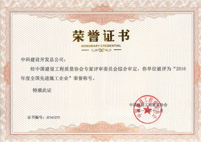 2016年度全国先进施工企业荣誉证书