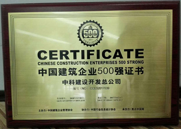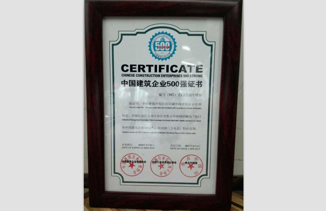 2017建筑企业500强荣誉证书2